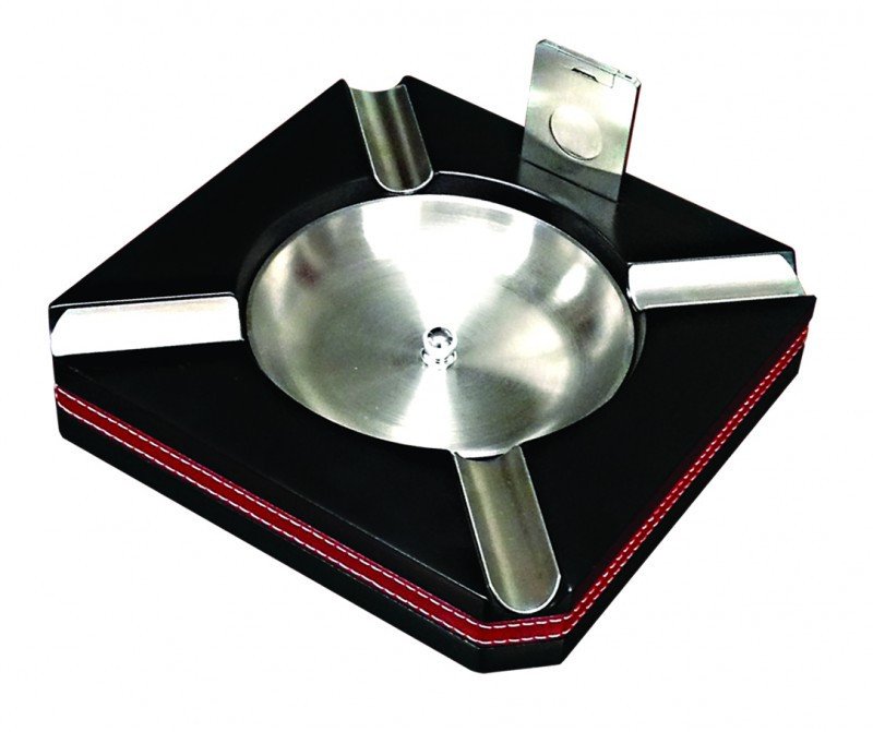 Leather Trim Ashtray With Cutter - 4 Cigar Wood Ashtray w/ Black Finish Leather Trim Cutter 7 1/2 L x 7 1/2 W x 1 3/8 H
