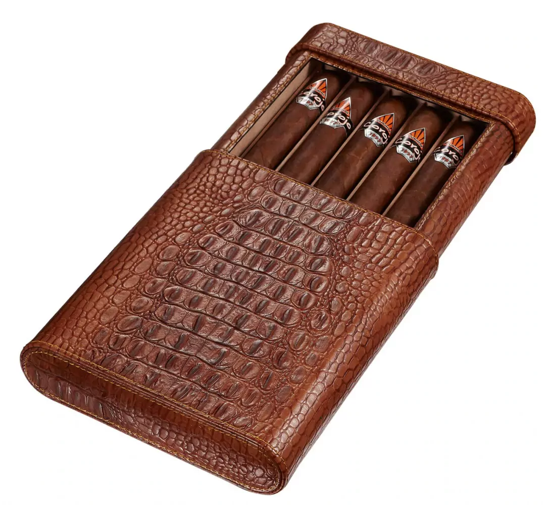 The Visol Rennes Crocodile Patterned leather travel case stores up to 5 of your favorite cigars in a cedar rest. With a detachable humidifier this case keeps your cigars in pristine condition when traveling. Not only does the travel case keep your cigars fresh and fragrant while traveling, but also has a crocodile patterned exterior making it look exotic and exclusive.