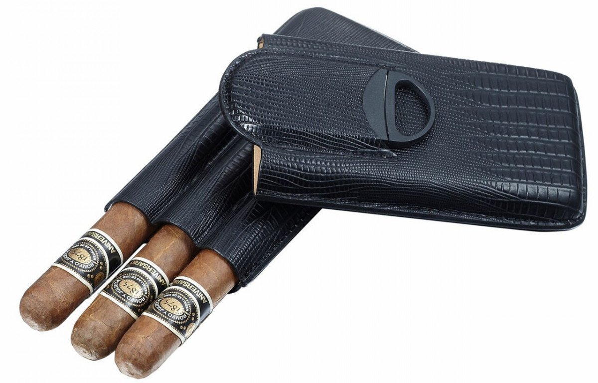Granada Black Leather 3 Finger Cigar Case with Cigar Cutter