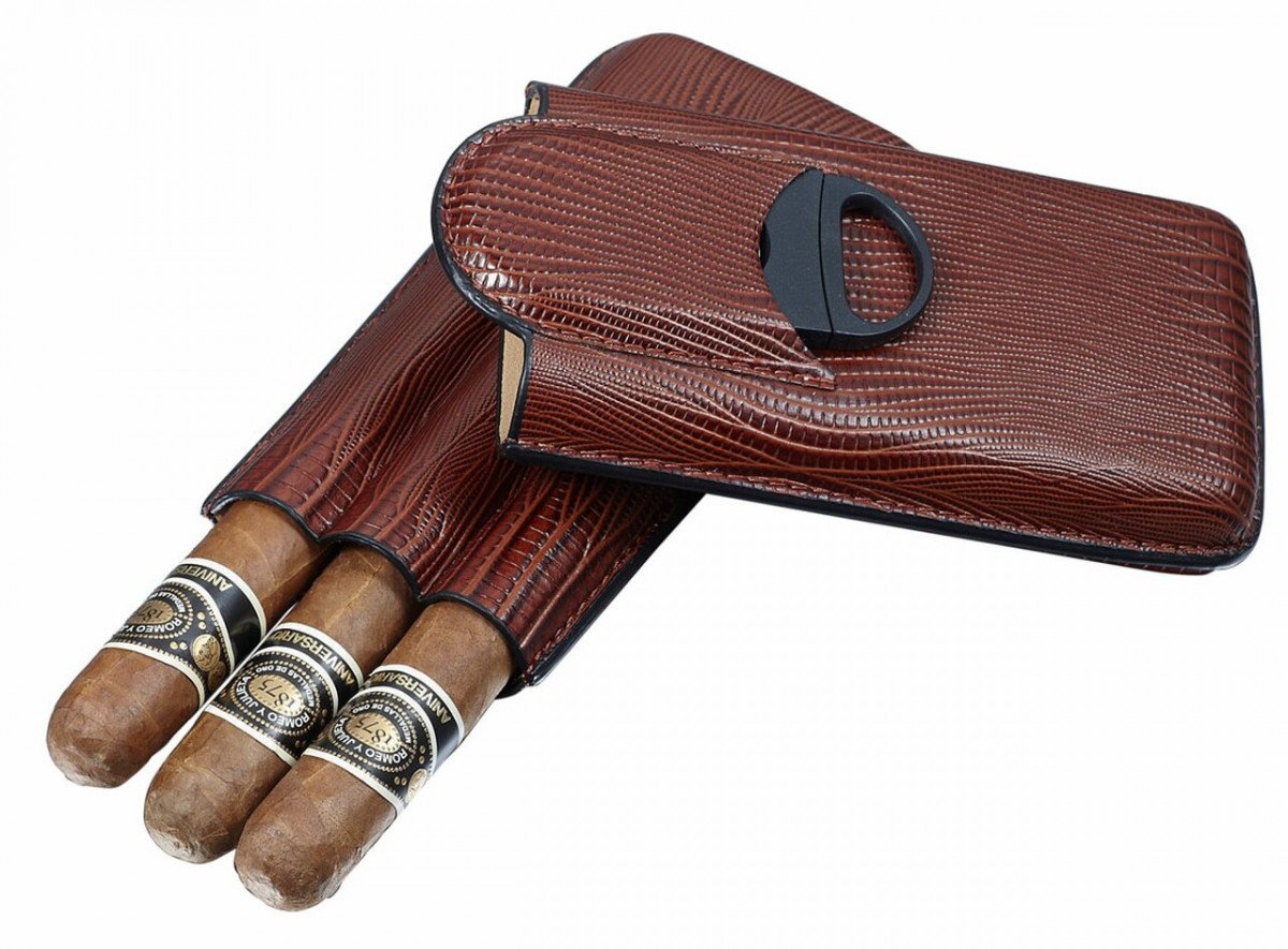 Granada Brown Leather 3 Finger Cigar Case with Cigar Cutter