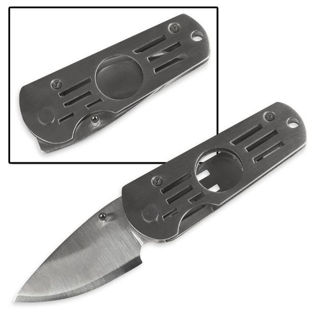 I wouldn't go strolling down a shady alley at night with this thing, but it definitely takes the term kill two birds with one stone to heart. The Survivor Cutter/Knife serves not only as a nice cutting utensil, it also makes short work out of cigars. Simply place the head of the cigar in the opening of the handle and squeeze the blade downward using your palm. But if you're more interested in slicing and dicing, you can simply flip the blade out and use it as a pocket knife, the choice is yours. Featuring an all metal design, and heavy-duty belt clip, you'll be toting this thing around everywhere. Blade is 2". Comes packaged in an attractive gift box.
