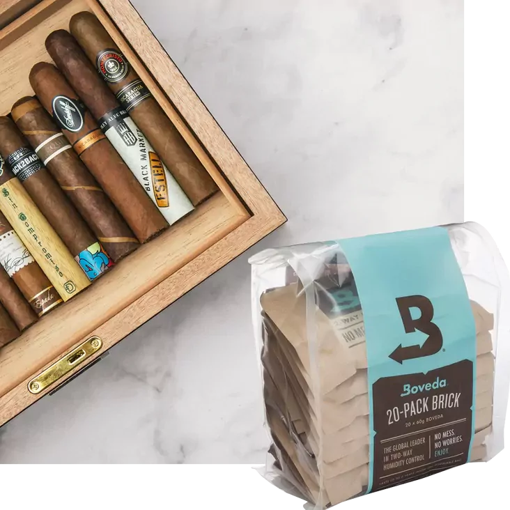 Stock up on Boveda with the 20-Pack Brick! Precisely control and maintain ideal cigar humidity for your wood humidor to protect the essential oils and sugars of premium cigars. No more mess of using sponges, gels or beads.
