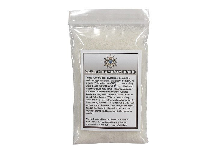 1/4 lb. Bag of Humidity Crystal Beads. Rechargeable and Reusable. 1 ounce (2 tablespoons) of dry beads yield approx 12 cups of hydrated crystals. Designed to Maintain 70% RH.