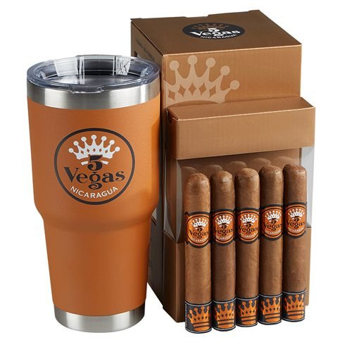 We love all cigars. Mellow, full….doesn’t matter. We’ll fire anything up. But we’d be lying if we said we didn’t have a few favorites…or “champions” if you will. One of those is 5 Vegas Nicaragua Cigars. The 5 Vegas Champion Cup Sampler includes five 5 Vegas Nicaragua cigars. These gems start off with an Ecuadorian Habano wrapper encasing some beautiful Nicaraguan tobaccos fillers and binder and offer up a medium-bodied profile that delights your palate with notes of caramel and leather, pre-dominantly found in the foot of the cigar. The stylish 5 Vegas branded tumbler holds up to 30 ounces of your favorite drink, keeping it cold, or warm, for hours. Pick yours up today!