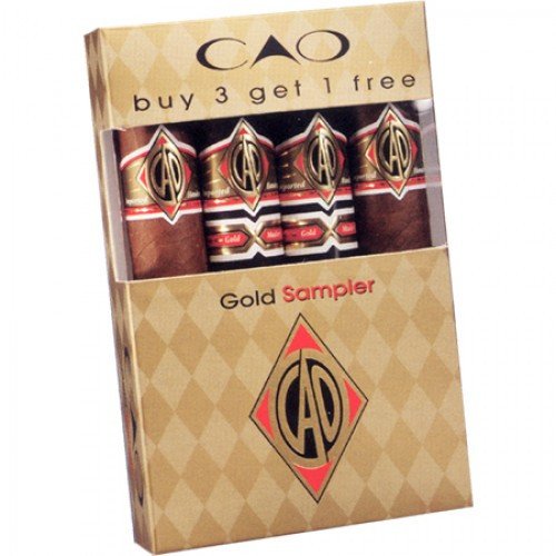 The CAO Gold 4 Cigar Sampler contains four 5x50 premium handmade cigars from CAO. 2 CAO Gold Robusto Cigars and 2 Gold Robusto Maduro Cigars are included in the sampler. The CAO Gold Sampler Cigars are blended with Nicaraguan long fillers and golden Ecuadorian Connecticut seed wrappers that give these cigars a smooth draw and milder taste than other CAO Cigars. Mellow aromas of vanilla and toasted nuts can be detected in the cigar smoke.