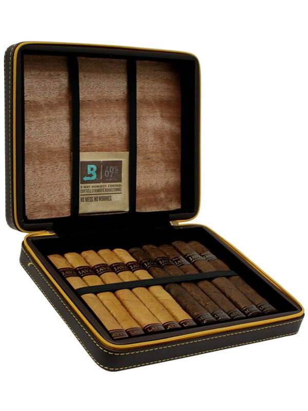 Among the most reputable and recognizable brands in the cigar market today, Rocky Patel proudly presents their Java Travel Case. A cigar brand built on reputation and quality, this beautiful cigar accessory keeps your cigars safe and fresh. Smokers are treated to 10 cigars (5 Java Latte and 5 Java Maduro) along with your purchase.