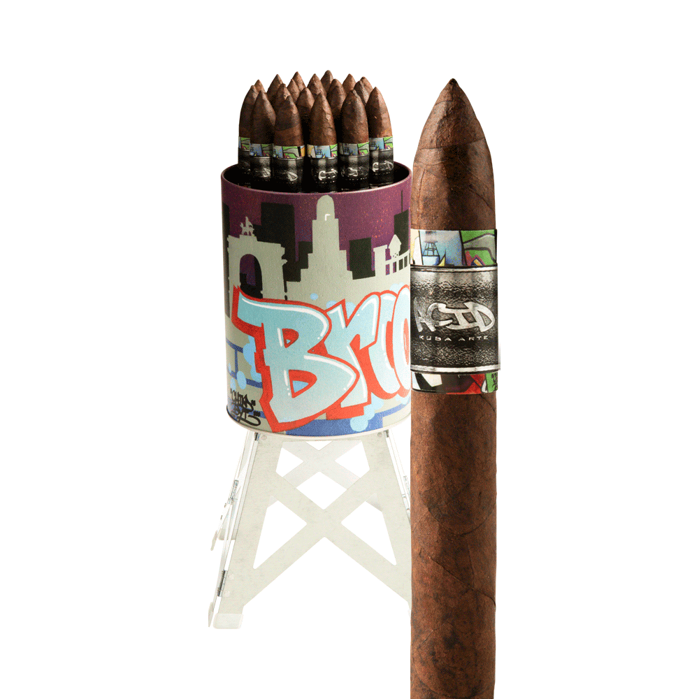 Giving a nod to the brands inner-city origins, ACID Kuba Arte Water Tower Chino #2 cigars are placed in stunning towers adorned with the edgy inner-city artwork from one of the top graffiti artists in Brooklyn, N.Y. The cigars start with a dark, oily, Broadleaf Maduro wrapper over an Indonesian binder, and premium Nicaraguan fillers grown on the Drew Estate farms. Then, its infused with Acid’s signature blend of herbal oils and spices. The result is a rich full-flavored smoke overflowing with notes of chocolate, earth, cocoa, and black cherry, along with an overall tobacco sweetness that ties these savory flavors together. Kuba Arte Water Tower Chino #2 cigars are considered by many to be one of the best Acid creations ever produced.