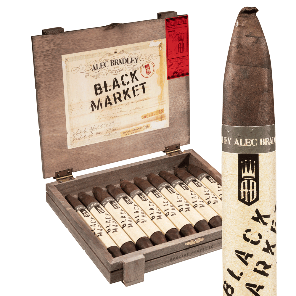 Alec Bradley Black Market Perfecto Hondraun (6 3/4" x 54) is a handmade masterpiece designed by the most respected and prolific person in the industry, Alan Rubin. Continuing with his billiant designs and creativity, this cigar gives us a terrific medium body handcrafted with premium long fillers from Honduras and Panama. Surrounded by a Nicaraguan Nicaraguan wrapper and Sumatra binder, this beautiful cigar gives a dynamic, well balanced, smooth, sweet flavor thats easily enjoyed by anyone and can be appreciated with freshing light craft beer.