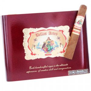 Decadent and superb in flavor and aroma, these box-pressed cigars are blended mostly with Nicaraguan long-fillers from A. J. 's farms in EstelĂ, Condega and Jalapa, plus some Honduran, and a naturally-sweet, nicotine-packed viso from Brazil. What makes Bellas Artes cigars even more unique and complex is the Havana '92 black varietal binder from the Quilali region of Nicaragua, and the proprietary AJF Hybrid "Rojita" wrapper, which is a cross between Connecticut 8212, Corojo '99, and Havana 2000. If you think it sounds delicious, wait 'til you taste it. Notes of cream, butter, cinnamon, sweet cedar, and orange peel abound in this perfectly-balanced creation from one of the hottest cigar makers on the planet. If you're looking for one of the most stunning smoking experiences to come out of Nicaragua, or anywhere for that matter, make room in your humidor for Bellas Artes.