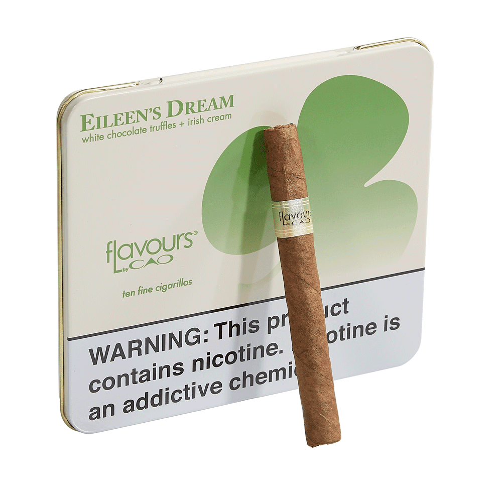 CAO Flavours Eileen's Dream Chocolate Cigarillo Cameroon (4" x 30) is a combination of Irish cream and white chocolate truffles. The Irish cream is made from superior Irish whiskey, frothed cream, and fresh coconut milk. White chocolate truffles subtly blend hazelnut paste, ground almonds, cocoa, and vanilla extract. These flavors mixed with smooth Dominican tobaccos and a grade-one Cameroon wrapper completes this five-star treat.