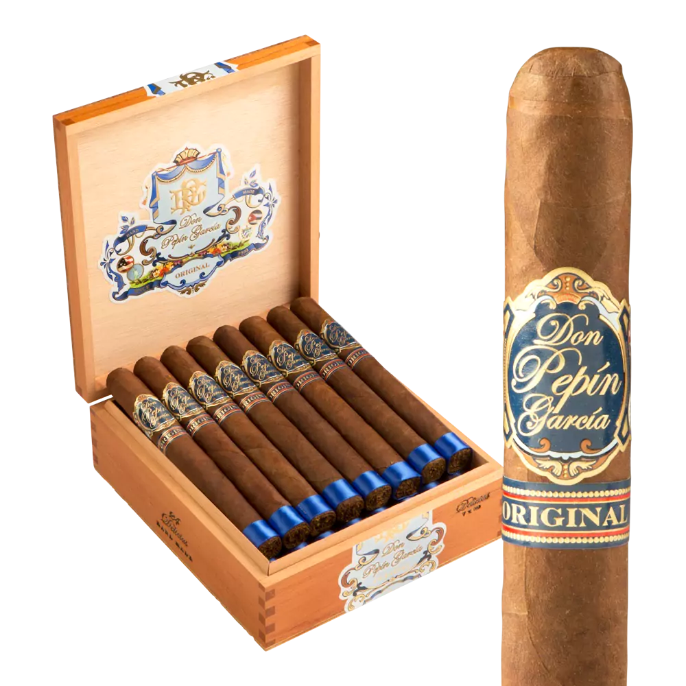 The famed Corojo '99 seed which crosses with Nicaraguan Ligero and Piloto Cubano is what makes up the Blue Label. The product of this marriage is the full-bodied Don Pepín García Blue Label Delicias Corojo Churchill (7" x 50) cigar, whose blend is fermented multiple times to the precise point where the magical combination yields a rich-looking brown and oily leaf producing an unbeatable smoke that connoisseurs find irresistible. A rich, full-bodied taste that leaves you finding Pepín's deft touch with tobacco entrancing.