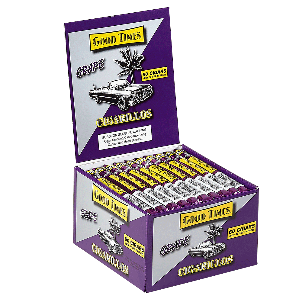 Good Times Cigarillos use a secret blend of exotic, high-quality tobaccos paired with sumptuous flavors to create smooth, slightly sweet smokes without equal. Measuring 4.2" x 27 and packed in convenient boxes of 60, Good Times Cigarillos are available in Napa Grape flavor.