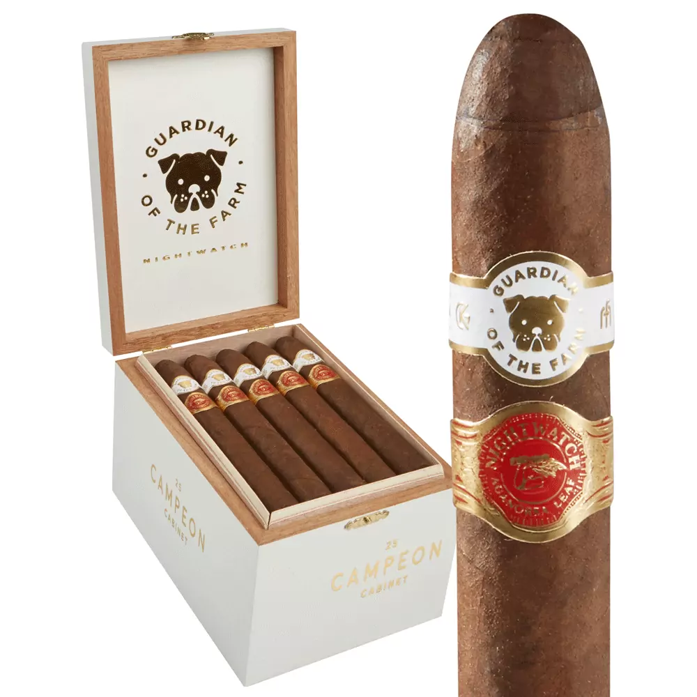 Guardian of the Farm Maduro Night Watch Campeon cigars are Nicaraguan puros that feature a gorgeous, oily, shade grown Corojo maduro wrapper over prized Nicaraguan binder and filler tobaccos grown on the famed Aganorsa farm. Nurtured in the nutrient dense Nicaraguan soil from this single farm, Aganorsa tobaccos provide a unique flavor and aroma that can’t be duplicated anywhere else on the planet. In addition, the cigars are named after the American Bulldogs that keep the valuable Aganorsa leaves safe from thieves. These highly guarded ingredients provide rich full-bodied notes of espresso, chocolate, wood, pepper, and cream.