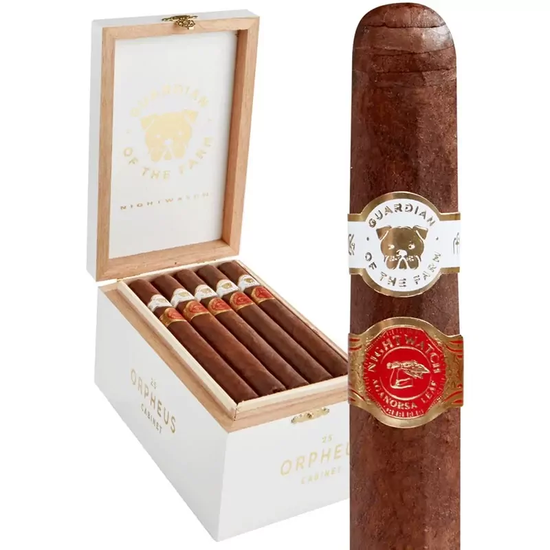 This Guardian of The Farm Nightwatch Orpheus cigar is made in Nicaragua. Outside, you'll find a Nicaraguan Jalapa Maduro wrapper. Inside, the binder is Nicaraguan, and the filler is Nicaraguan. The Guardian of The Farm Nightwatch Orpheus is a Medium-Full Bodied Lonsdale shaped cigar with a length of 6.00 and a ring gauge of 44.
