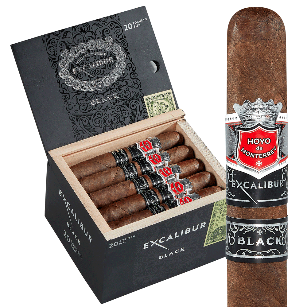 Hoyo de Monterrey celebrates the 40th anniversary of the Excalibur line with the Excalibur Black Robusto (5.0" x 50). The blend in these full-size cigars differs from the cigarillo and mini cigars of the same name. A Connecticut Broadleaf wrapper encases an Ecuador Sumatra binder and Honduran and Nicaraguan long fillers. Smoking this stick will give you notes of leather and minerals. Take your place at the round table and enjoy!