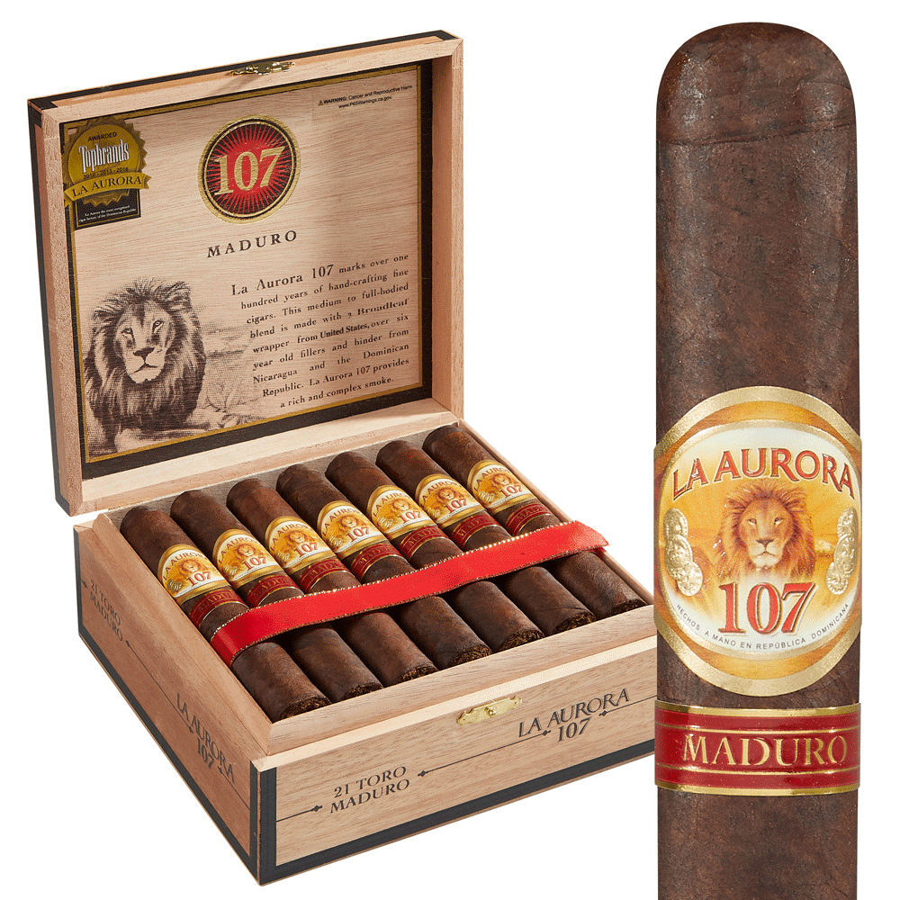 La Aurora has been along for quite a while now and for good reason: simply, they make great cigars. La Aurora 107 Toro Maduro (5 1/2" x 54) is a new iteration on the successful original released in 2010. This Aurora 107 is a bit sweeter than the original Habano older brother. The sweetens comes from the Connecticut Broadleaf Maduro wrapper used on this cigar which has a medium-to-full body.