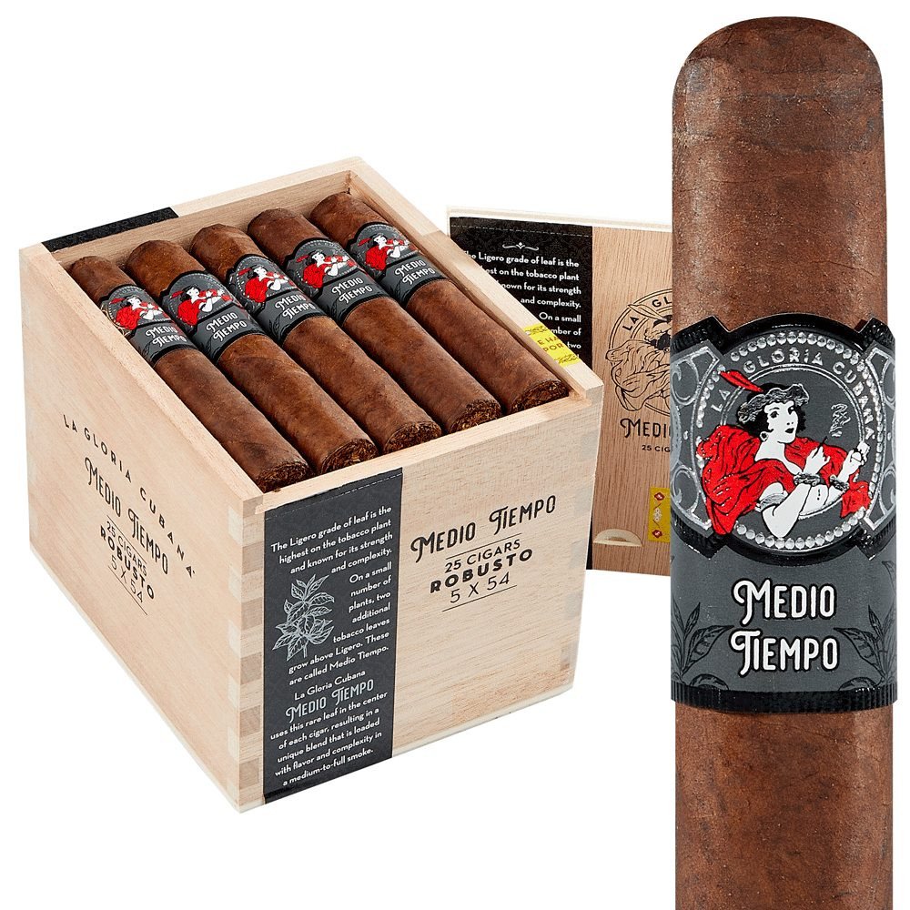 Description The La Gloria Cubana Medio Tiempo Robusto is a full-bodied premium cigar whose filler is packed with the desirable and hard-to-get medio tiempo leaf. This sought-after leaf is the top most leaf on a tobacco plant, and it gets the most exposure from the sun.