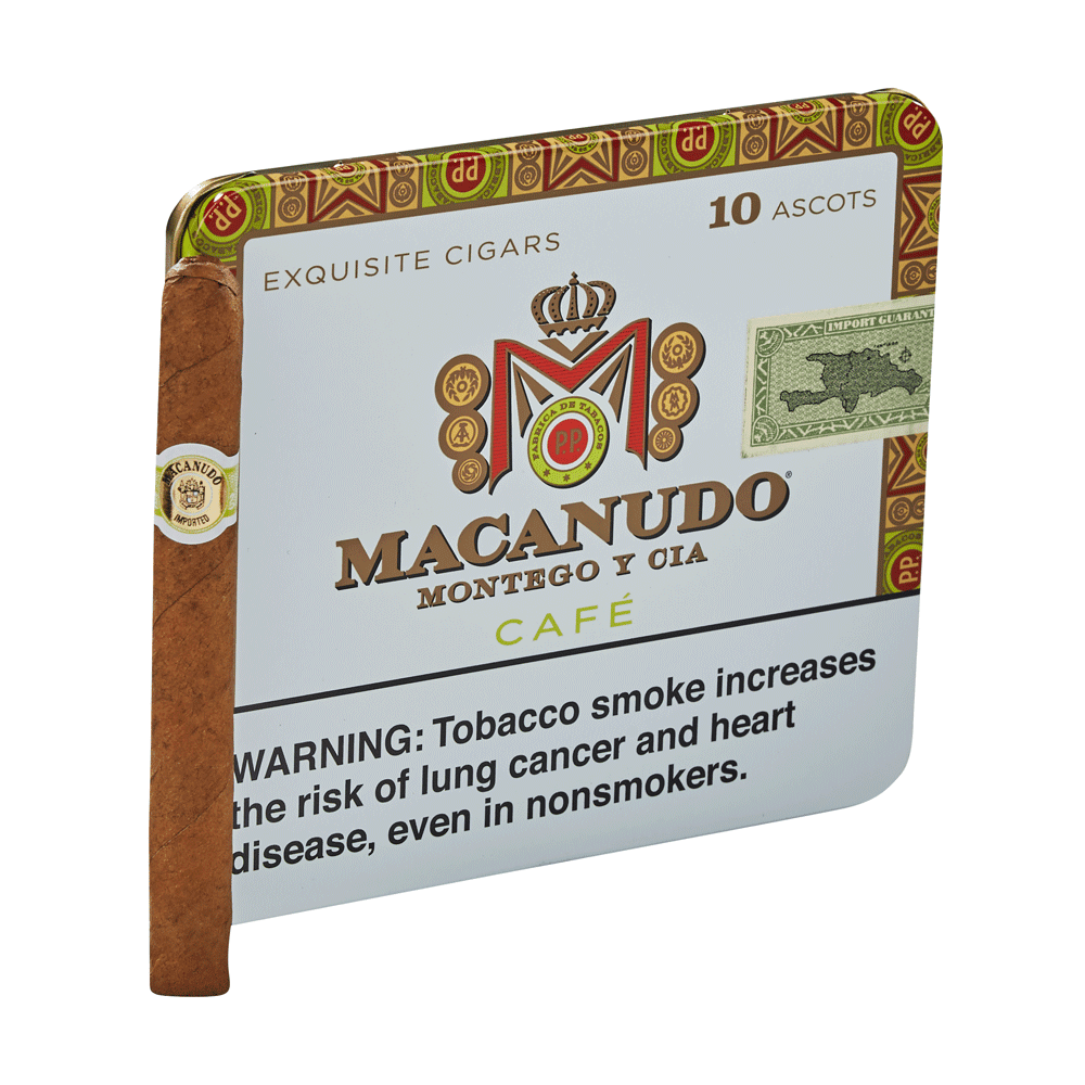 Hailing from the Dominican Republic is the Macanudo Cafe Ascots Connecticut Cigarillo (4 1/8" x 32). Each cigarillo is handmade with smooth Dominican fillers, a San Andres binder from Mexico, and super high-premium Connecticut Shade wrapper that all blend together creating an incredibly mellow, smooth-body.