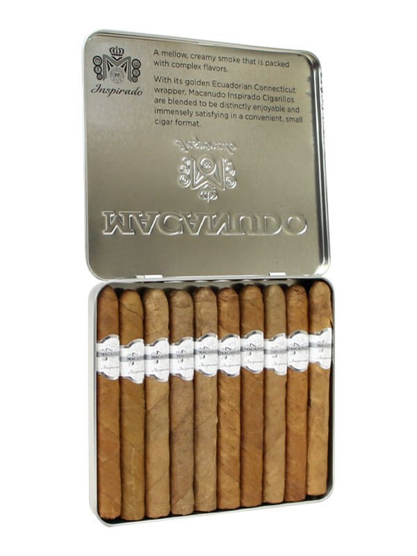 Macanudo Inspirado White Cigarillos are petite 4.18 × 32 cigars that offer the same delicious flavors as its larger counterparts. This luxurious new expression from the famed Macanudo line, features a silky golden-brown Ecuadorian-seed Connecticut wrapper over an Indonesian binder, and aged Nicaraguan and Mexican filler tobaccos. Mellow to medium bodied in strength, and creamy smooth like the brands iconic Café line , Inspirado delivers a uniquely modern flavor profile of wood, sweet cream, some earthiness, cocoa, and just the perfect touches of spice. Sold in affordable packs of 10, these pint size flavor bombs offer a decadent Macanudo smoking experience for those who don’t have time to kick back and enjoy a full-sized premium cigar.