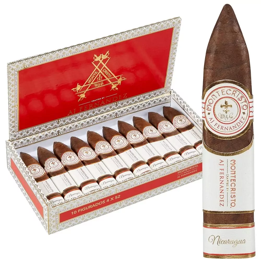 Montecristo Crafted By AJ Fernandez Figurado (4" x 52) is covered in a toothy Ecuador Sumatra Oscuro wrapper with a San Andres binder. These premium cigars are filled with Honduran and Nicaraguan long-fillers then pressed into a candy-bar box press. With a medium to full-body flavor profile, you will notice hints of pepper, coffee and umami.