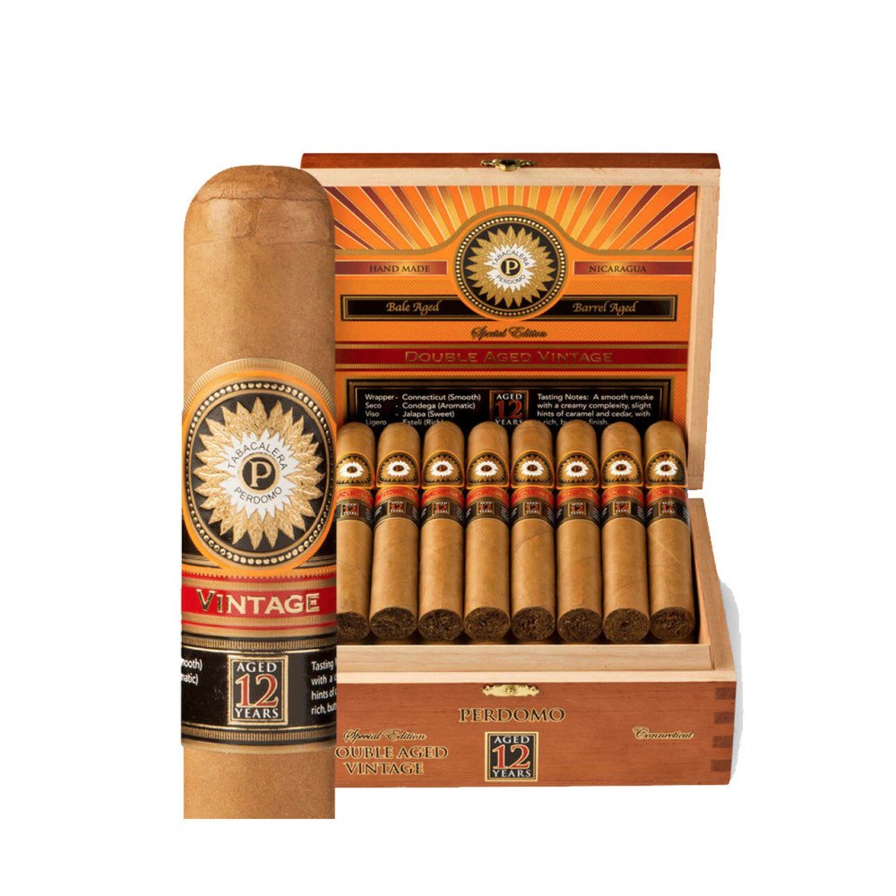 The Perdomo Double Aged 12 Year Vintage Connecticut Churchill cigars are double-aged for 12 years – 10 in bales and 2 more in bourbon barrels. Proving why Perdomo is one of best-selling brands in America, this medium body masterpiece is impeccably rolled, slow burning, and loaded with flavors of nuts, coffee bean, spice, caramel and just a hint of bourbon infused from the barrel.