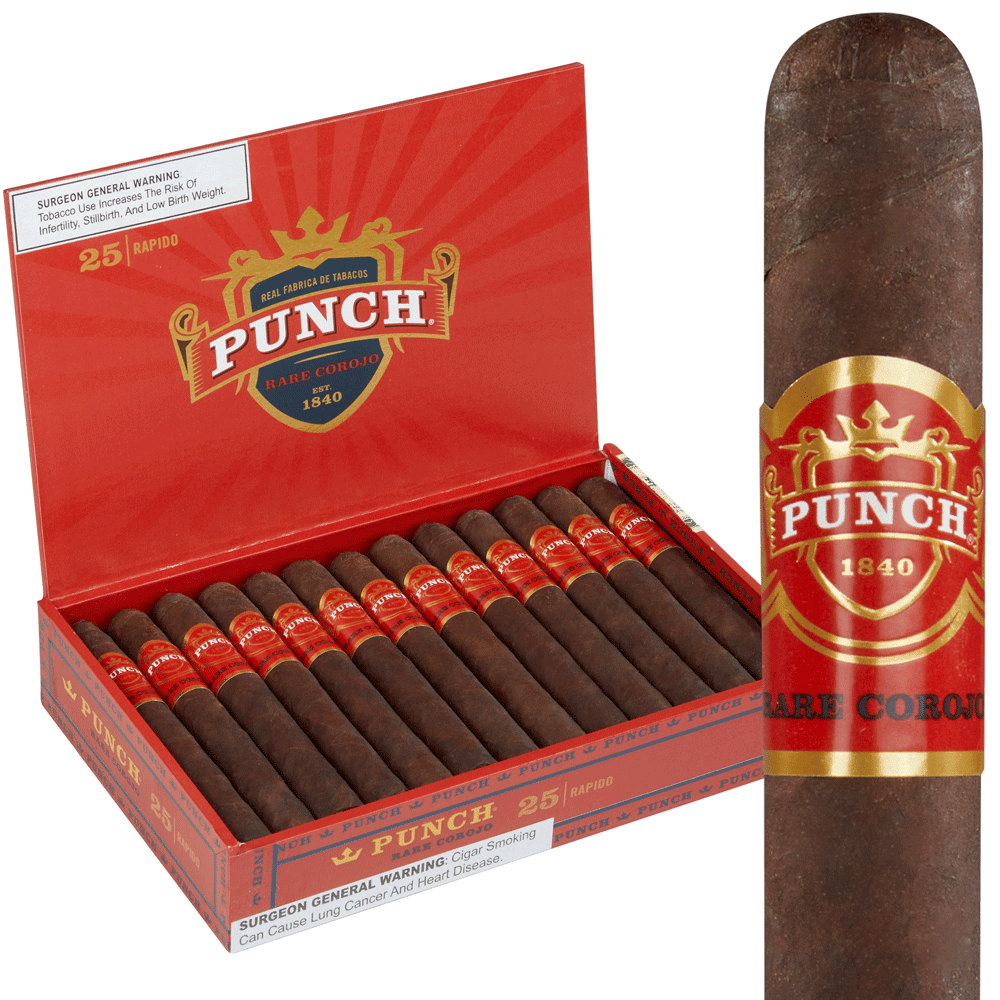 Punch Rare Corojo cigars are made with the scarce dark, oily Corojo wrapper enveloping a select blend of Nicaraguan, Honduran Havana-seed and Dominican filler tobaccos. Complemented with a true Connecticut Broadleaf binder, the Punch Rare Corojo incorporates both quality and rich, robust taste. If you want a Punch cigar with an extra kick to it, Punch Rare Corojo, in the distinctive red box, is the one for you.