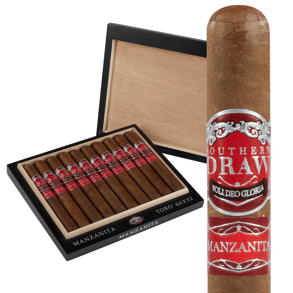 Southern Draw La Manzanita Toro (6.0 x 52) uses a dark, red Habano hybrid wrapper around a Habano binder and an Nicaraguan filler. This medium to full-bodied profile gives you notes of leather, earth, spice, and cedar.