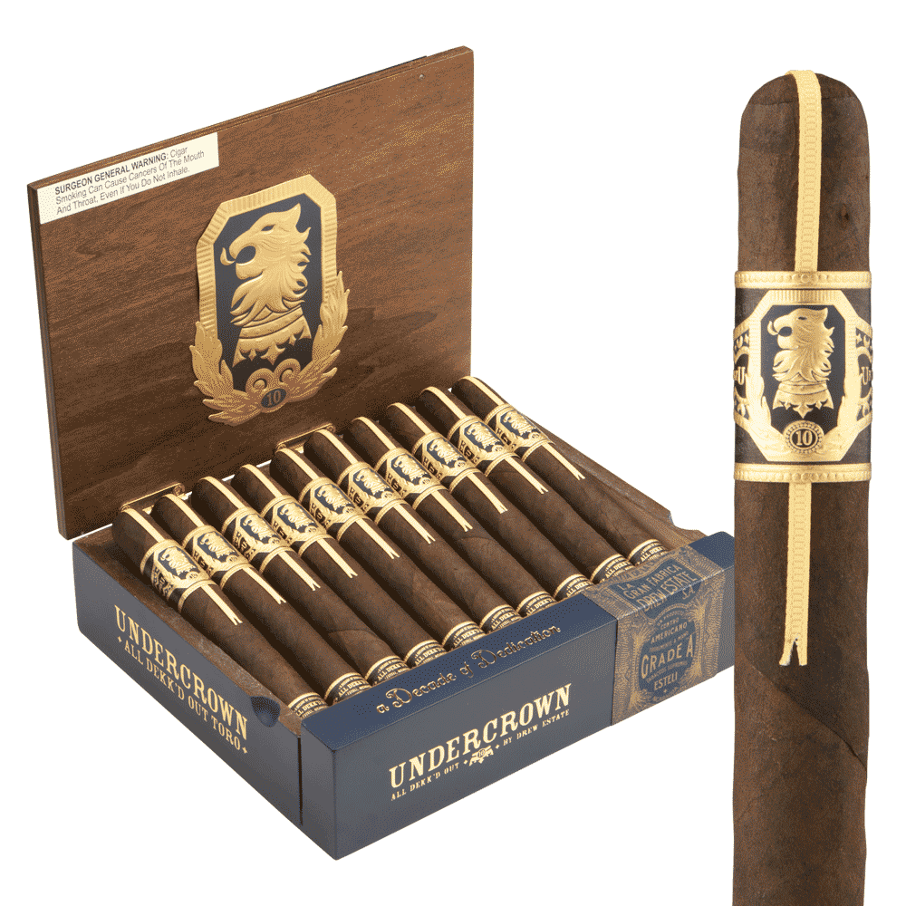 The Liga Undercrown 10 Toro is a full-strength, full-bodied anniversary premium cigar that celebrates “A Decade of Dedication.” It is a brand that was actually “Born on the Factory Floor.” This celebratory cigar sports a delicious, oily Mexican San Andres maduro wrapper that artfully sheaths a USA Connecticut Broadleaf binder and long-filler leaves from Nicaragua. This awesome three-nation blend delivers a hot chocolatey smoking experience with an underlying natural sweetness and accented with an intense peppery sensation. These rich flavors are harmoniously accompanied with irresistible fruity, earthy and woodsy notes. Expertly hand crafted at the La Gran Fabrica Drew Estate factory in Nicaragua, the Liga Undercrown 10 is “All Dekked Out” with a special ribbon, band, and foot band, and tucked inside a commemorative collectible box. Order your box(es) today!