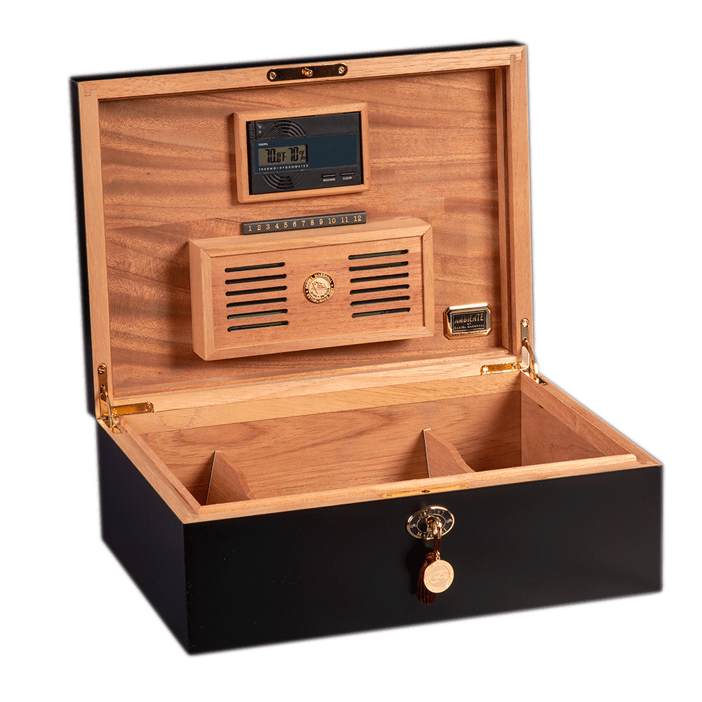 High end cigars deserve a luxurious place to rest and Daniel Marshall has you covered. Known for their premium humidors, Daniel Marshall humidors are sought after worldwide. Inside, these beautiful humidors are lined with Spanish cedar and include a humidification system and digital hygrometer. On the outside is a classic jet-black finish adorned with gold hardware that is a great accent to any room. There is even a lock to keep your premium cigars safe! The Daniel Marshall Ambiante comes in either 65 or 125-capacity.
