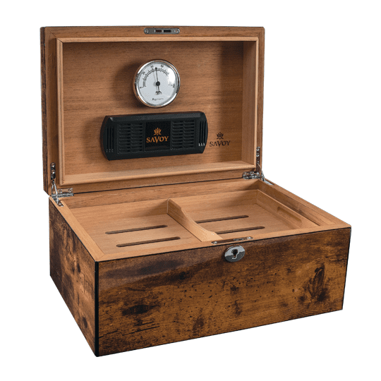 Savoy Mesquite Humidor provide an optimal environment for storing and aging your cigars. Precise assembly ensures a consistent, reliable seal in every box. The highly desirable Mesquite series reveals striking wood grains in a polished, luminescent finish with marvelous transition. 11.75 x 9.5 x 5 Holds up to 50 cigars.