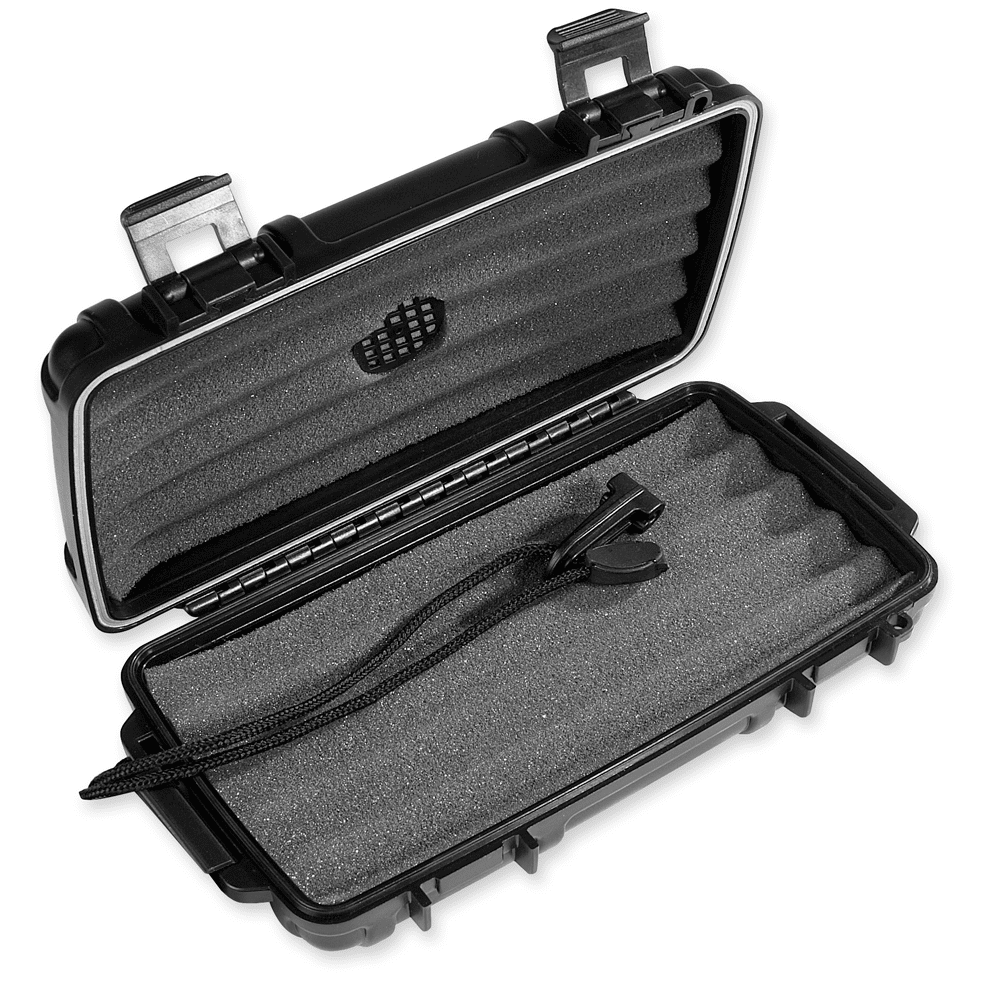 The Herf-a-Dor X5 Travel Humidor is perfect for taking your sticks wherever you go. With comfortable foam and a humidifier to keep your cigars fresh, this 5-capacity unit will hold up to five Churchill-sized cigars. With state-of-the-art clips to keep it closed, Herf-a-Dor X5 creates an air-tight, impenetrable seal! Here’s the short version: