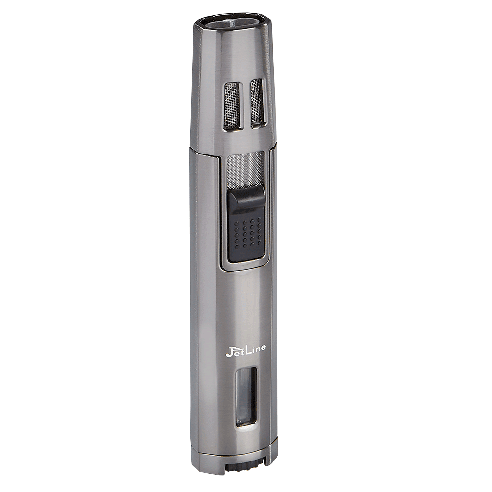 Don’t be fooled by this compact, pen-like lighter, the dual torch flame ignites with ease for just as reliable of a light to your cigar as any other Jetline lighter. R-200 is sleek, and made to look like a pen and comes in a rubberized black finish. Control your flame height with the large and easily accessible flame adjustment wheel, and keep your fuel in check with the transparent fuel tank window. This torch lighter allows you to comfortably ignite the flames with a push up single-action button. R-200 is a small lighter backed by precision and quality.