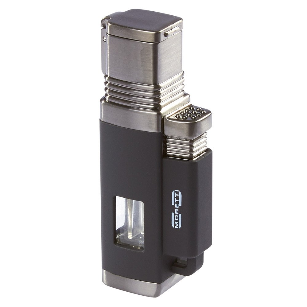 This attractive quad flame lighter from Moretti come in a stylish black finish and is equipped with a fuel viewing window, an adjustable flame and a fold out punch cutter.