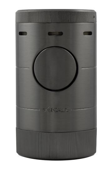 The Volta bundles XIKAR's patented technologies to deliver a high performance quad flame tabletop lighter. The oversized push button ignition fits flush against the cylindrical metal body creating a powerful appearance. The high tech camera aperture-inspired lid protects the quad burners, keeping debris out with a quick twist of the top lid.
