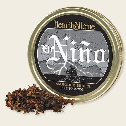 Hearth & Home Marquee Series El Nino was created to be our featured blend at the 2013 West Coast Pipe Show. El Nino is a hard tobacco to classify. The base is a ripe, matured red Virginia, enriched by a good helping of Acadian Perique and some dark-fired Kentucky. To make the blend rounder and to add touch of mellow sweetness, some unsweetened black Cavendish is included. The final touch is the faintest touch of Latakia to deepen the flavor. El Nino produces large volumes of creamy smoke, and it's fairly robust, so it's the perfect repast to follow up a nice meal.El Nino is kicking in, and it's going to be a fun ride.