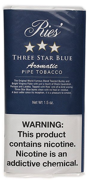 Iwan Ries' original, world-famous blend, Three Star Blue features toasted Burley and Bright Virginias, with just a touch of Black Cavendish, Perique, and Latakia. Topped with Ries' one-of-a-kind aroma, Three Star Blue has been one of the blender's best sellers since its inception — a pleasure to smoke and pleasing to those around you.