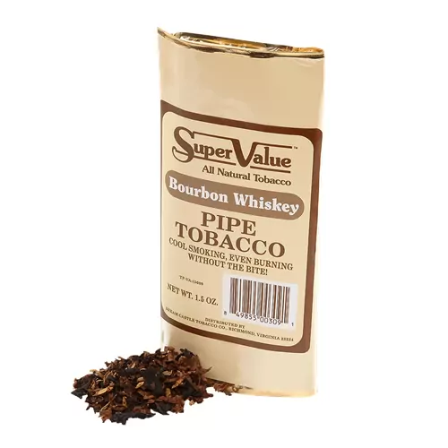 Super Value Bourbon Whiskey uses fine Virginias and Burleys to produce a cool smoking, mellow blend enhanced with a premium sweet Bourbon Whiskey flavor. With the gentle flavor but enjoyable room note of Super Value Bourbon Whiskey, it will make you want to grab an extra bag.