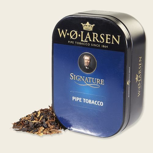 Get a whiff of W.O. Larsen Signature pipe tobacco. This Danish-style aromatic uses Virginias from two continents combined with Mexican and Kentucky Burleys. Some fermented black Cavendish tobacco is added for extra mellowness. A unique top note of fruit, caramel and vanilla finishes this delectable blend. Signature is an enjoyable tobacco packaged in the W.O. Larsen limited edition collector's tin.