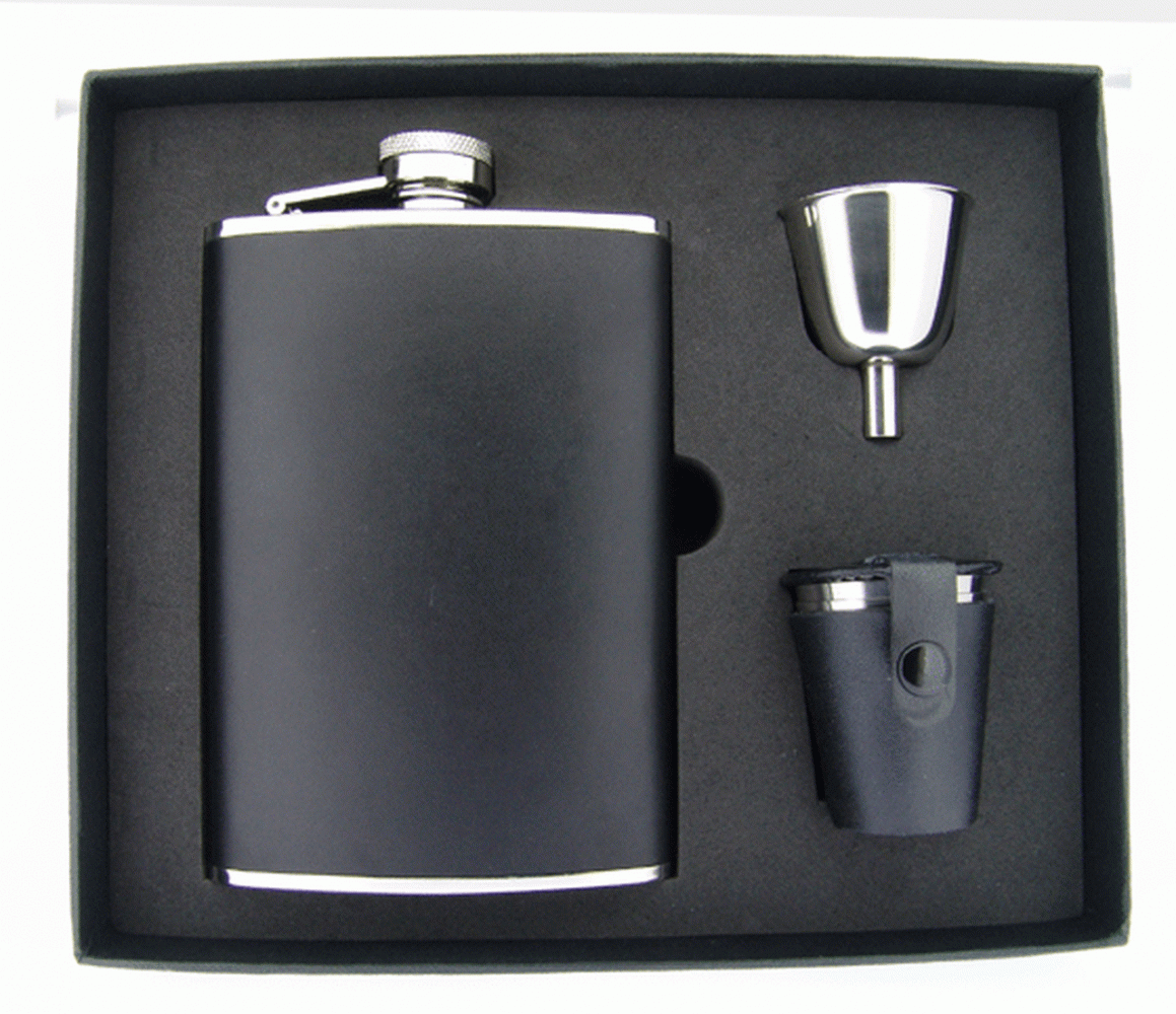 • This gift set includes three stainless steel shot cups with black leather carrying case , a stainless steel funnel along with the stainless steel flask